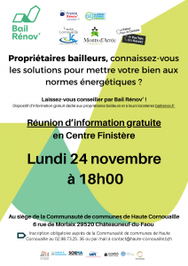 L’Adil du Finistère, Habitat et Humanisme Finistère et Soliha Bretagne organisent, en partenariat avec les Communauté de communes de Haute Cornouaille, de Monts d’Arrée Communauté et Poher Communauté, une réunion d’informations gratuite pour les propriétaires bailleurs, dans le cadre du dispositif national Bail Rénov.